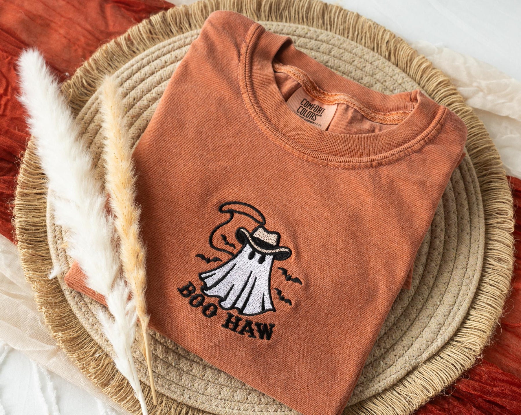 Embroidered Boo Haw Ghost T-shirt, Yam Colored T-shirt, Trendy Fall T-shirt, Fall shirts for Women, Cowboy Ghost Fall Halloween, BO1-C-97